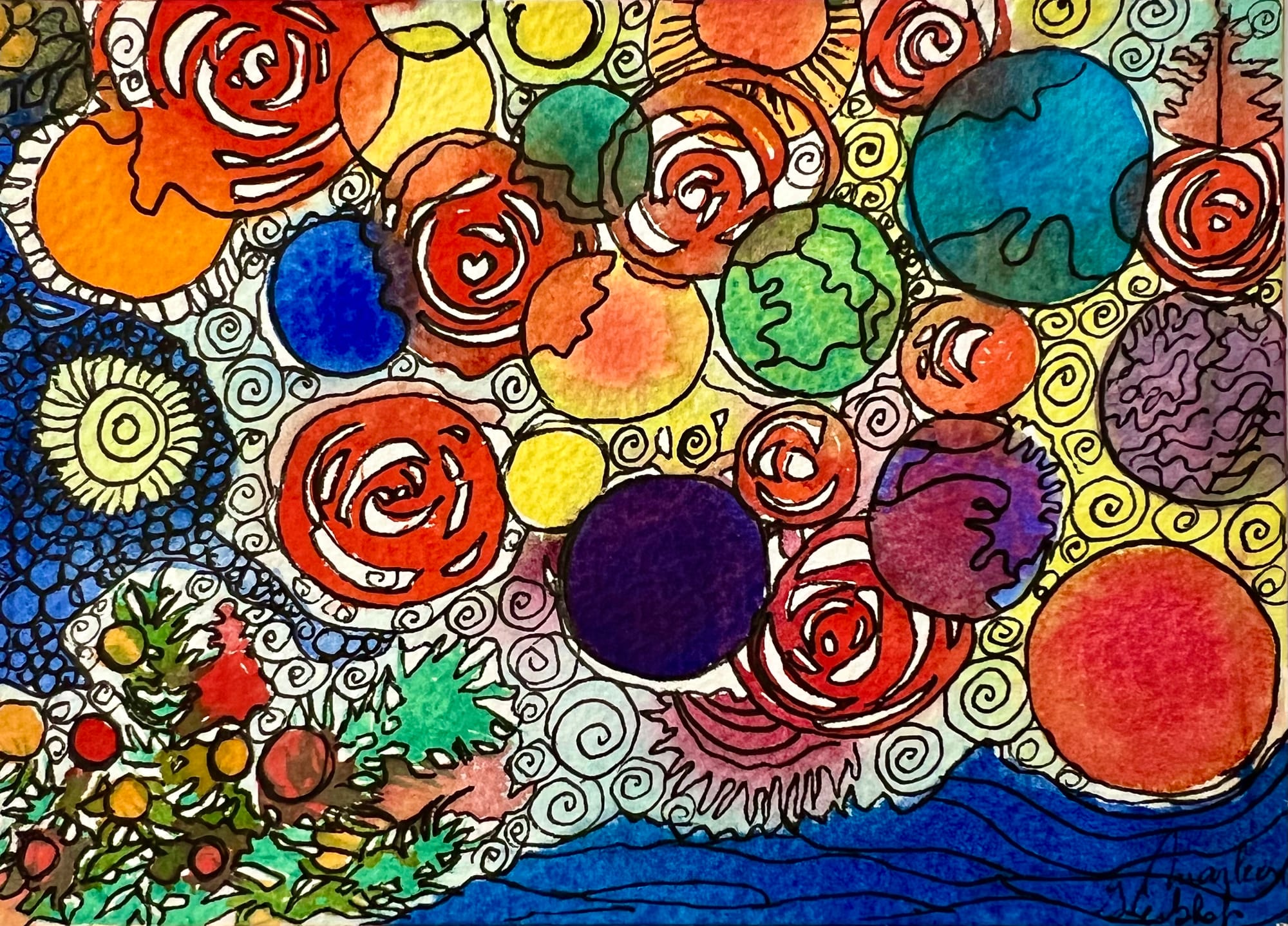 We maken originele kerstkaartjes in aquarel gecombineerd met zentangels en genieten daarbij van het rustgevend effect.